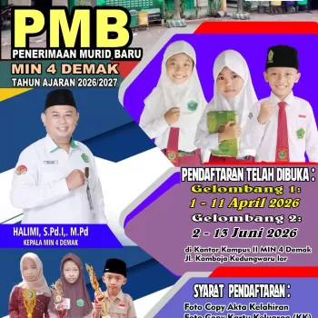 "PMB" Penerimaan Siswa baru Telah dibuka MIN 4 DEMAK TAHUN AJARAN 2026/2027 Gelombang 1 : Tanggal 1 - 11 April 2026 Gelombang